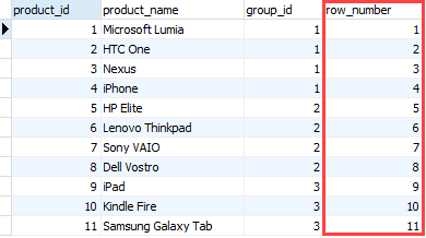 PostgreSQL ROW_NUMBER order by product name In the following query, we use the PARTITION BY clause to divide the window into subsets based on the values in the  group_id column. In this case, the ROW_NUMBER() function assigns one to the starting row of each partition and increases by one for the next row within the same partition.